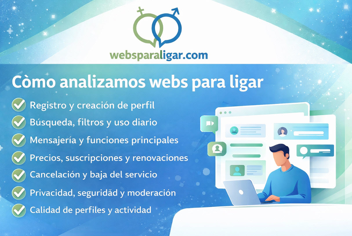En WebsParaLigar.com analizamos webs de citas con un enfoque práctico y realista. Nuestro objetivo es ayudarte a entender cómo funciona una plataforma antes de registrarte o pagar, explicando de forma clara qué puedes esperar del uso diario, los precios y las condiciones.